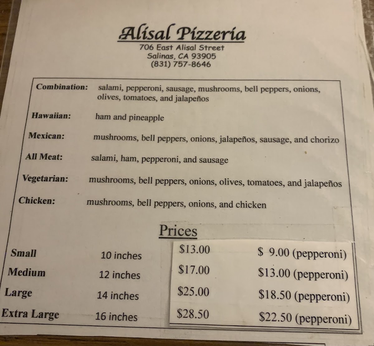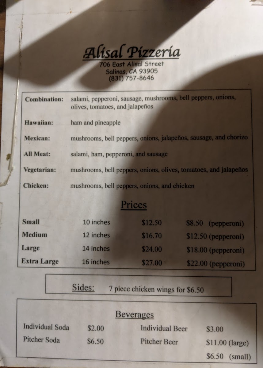 Alisal Pizzeria offers a straightforward and comforting menu centered around classic, well-loved pizza varieties. The menu feels familiar and approachable, making it easy to find something satisfying whether you're dining in, grabbing a quick bite, or sharing a casual meal with friends and family.
